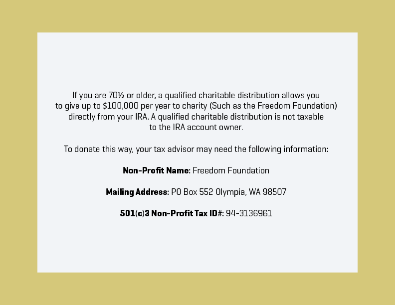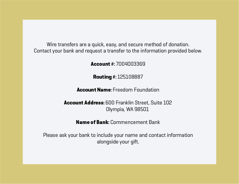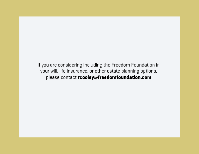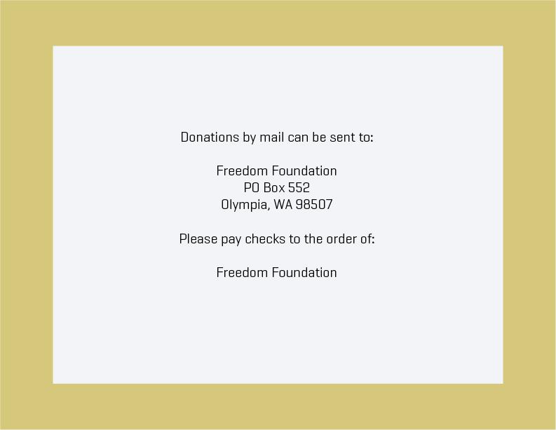 Thank you for supporting the Freedom Foundation, a 501(c)(3) Non-profit. All donations are kept confidential and are tax-deductible. Our EIN is 94-3136961.